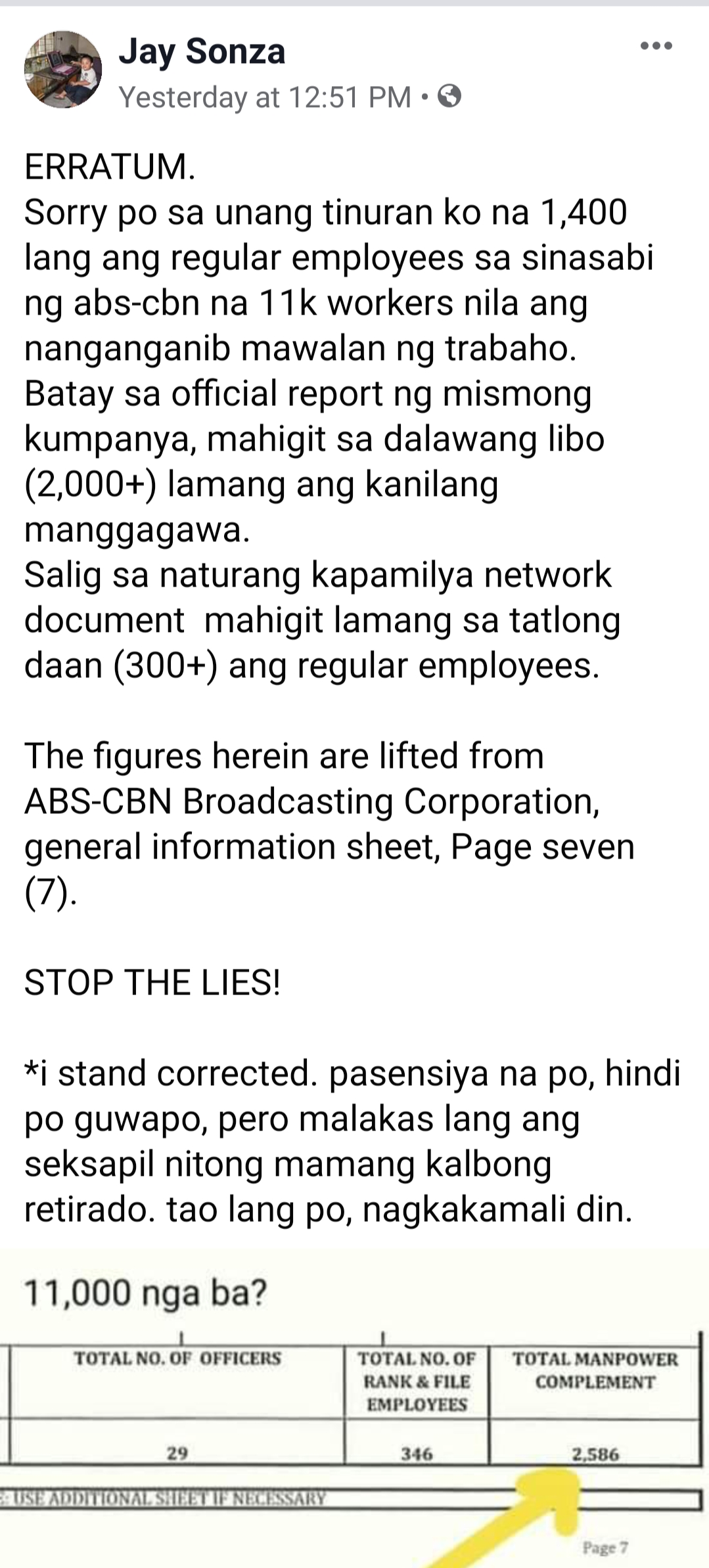 Ang nakita lamang ni Jay Sonza ay numbers reflect ONLY the employees of ABS-CBN, not the subsidiaries. Syempre tamad silang magresearch eh. Kaya umabot ng 11,000 kasi kasama ang mga subsidiaries ng company.