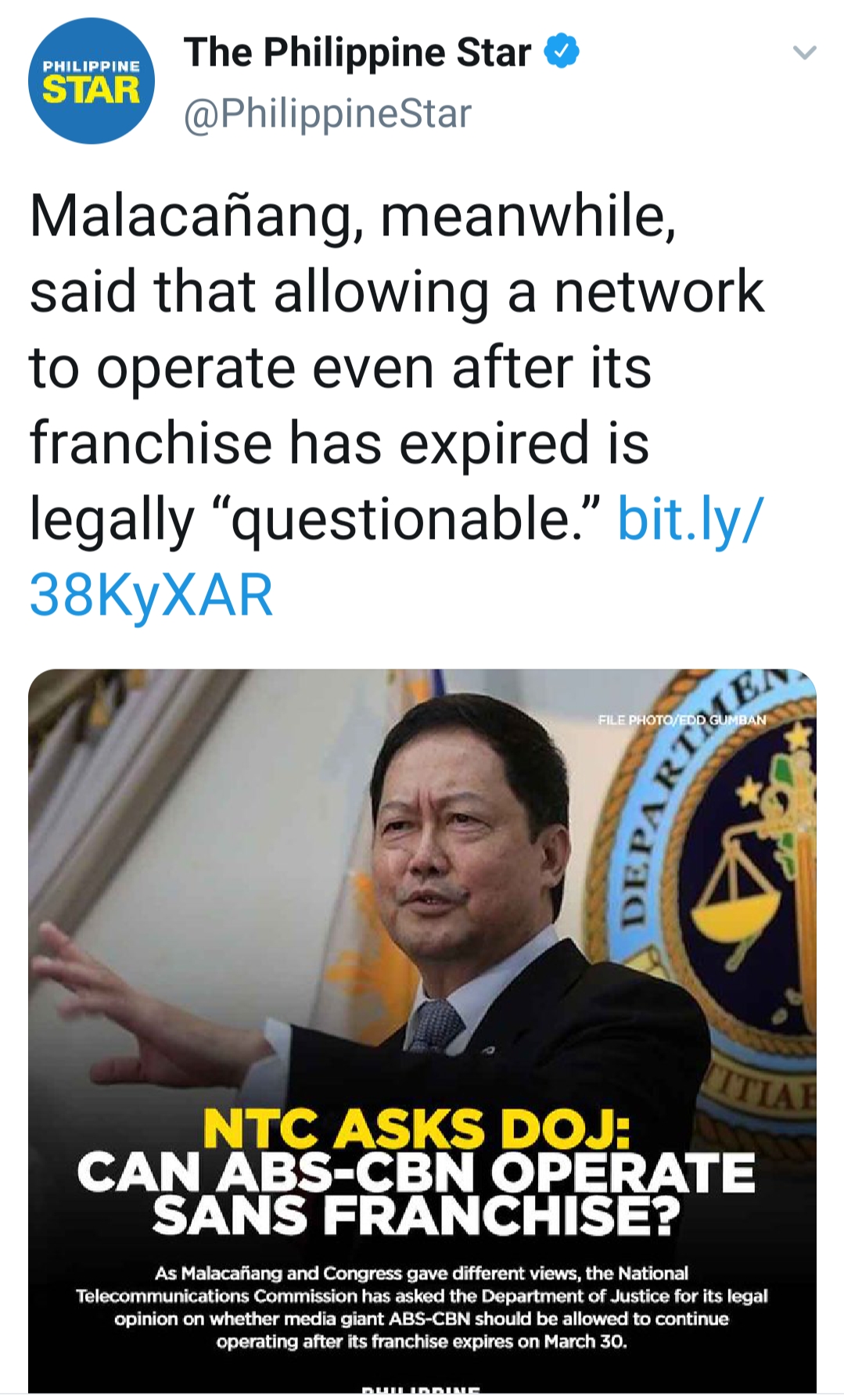 Ang reason niya puwede naman daw mag operate kung mabibigyan ng extension ng NTC. Luh fake news iyan. Iba ang sinasabi ng Malacañang.