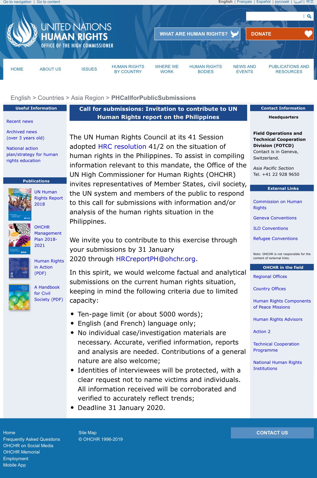 “United Nations Office of the High Commissioner for Human Rights invites UN Member States, civil society, UN system and members of the public to submit info or analysis on PH human rights situation, following UN Human Rights Council resolution in June 2019.