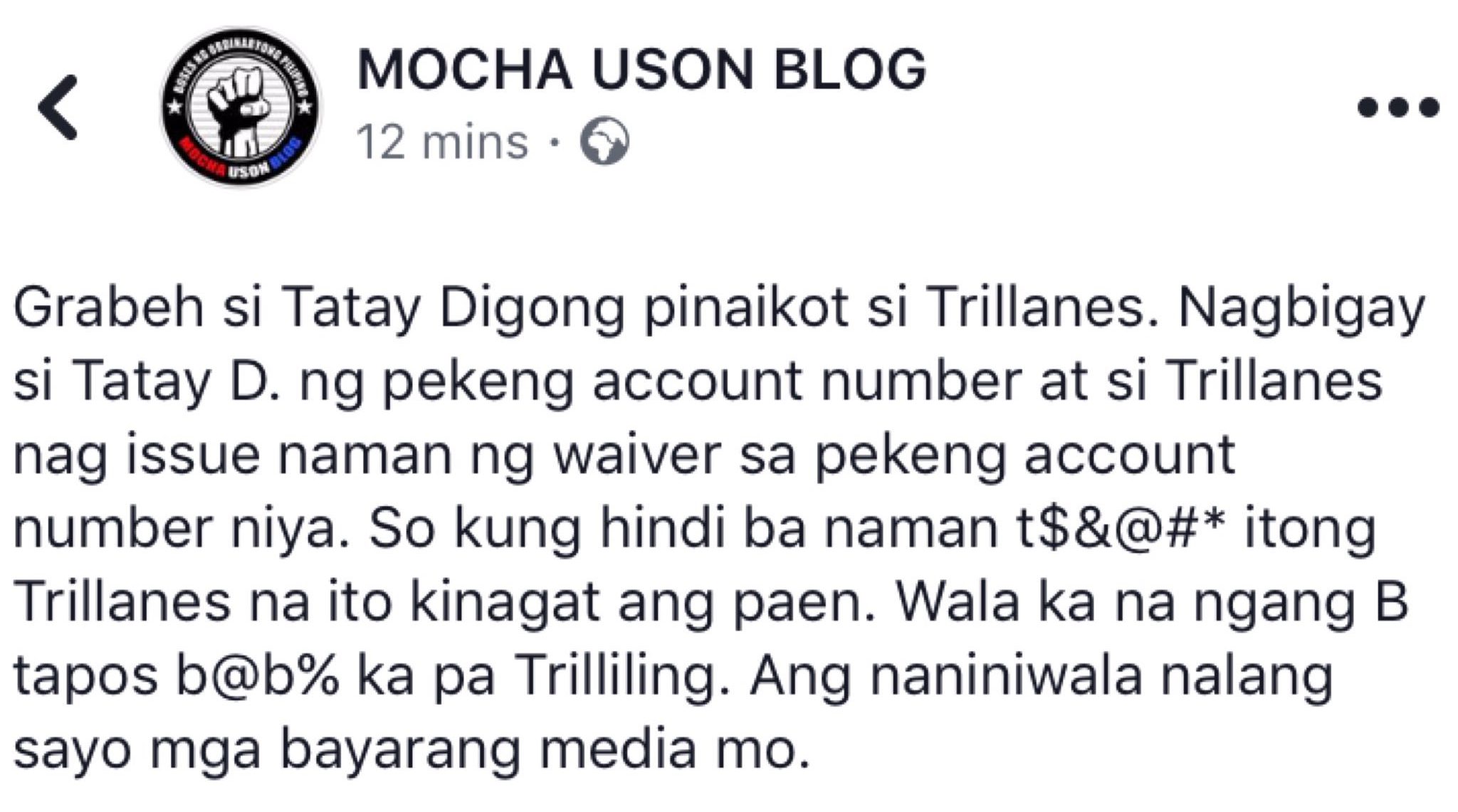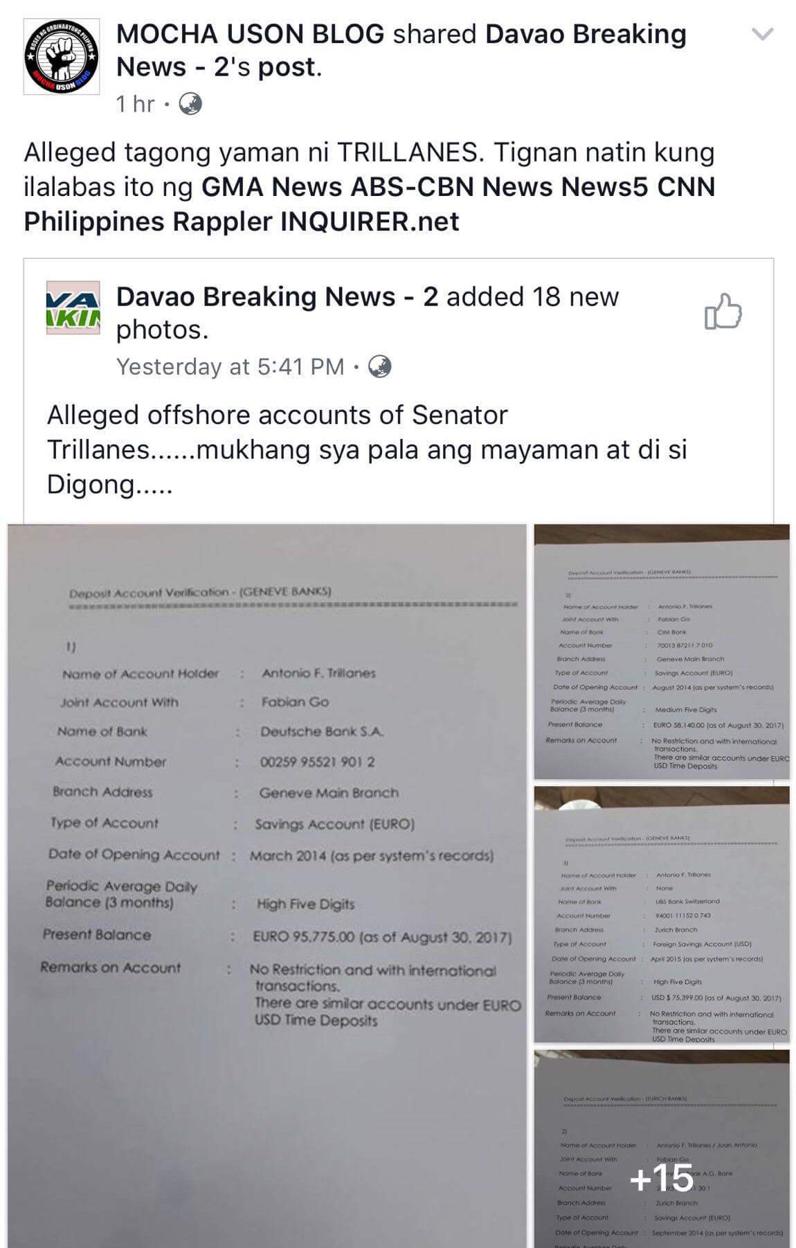“Sasampahan daw po ako ng kaso ni Sen. Trillanes dahil sa pag-share ko sa Facebook ng kanyang bank accounts. Unang-una, paki-Google po ang ibig sabihin ng ‘alleged’ or ‘allegedly’dahil mahilig naman kayo mag-Google Mr. Senator Trillanes (Sen. Trillanes said he will file a libel case against me because I shared his bank accounts on Facebook. First of all, please Google search what ‘alleged’ or ‘allegedly’ means, since you like to Google, Mr. Senator Trillanes).”