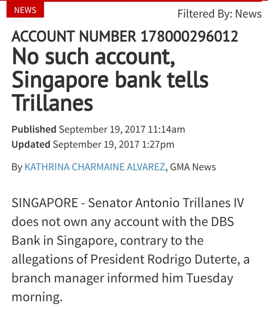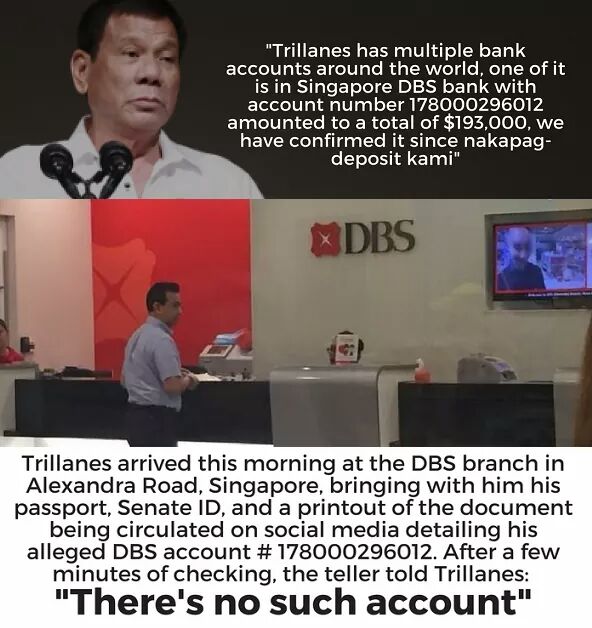 Pahiya ka uli no? Ayon sa DBS Bank in Singapore wala daw ang account number na imbento niyo. Ang masama pa nito pinahamak mo pa si Poon mo at pinasahan mo ng fake info. At ito naman si President Duterte, naniwala naman sa yo, nagpa presscon pa.