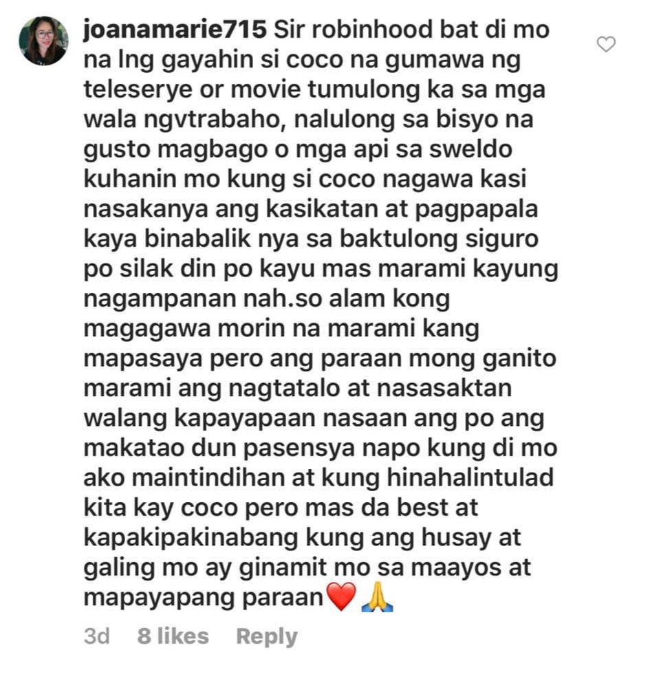 Walang masama sa comment at totoo naman na ginagawa yun ni Coco Martin na tulungan at bigyan ng second chances ang mga artistang wala ng trabaho. Pero mukhang minasama ni Robin Padilla ang sinabi ng netizen at ito ang naging reply niya.
