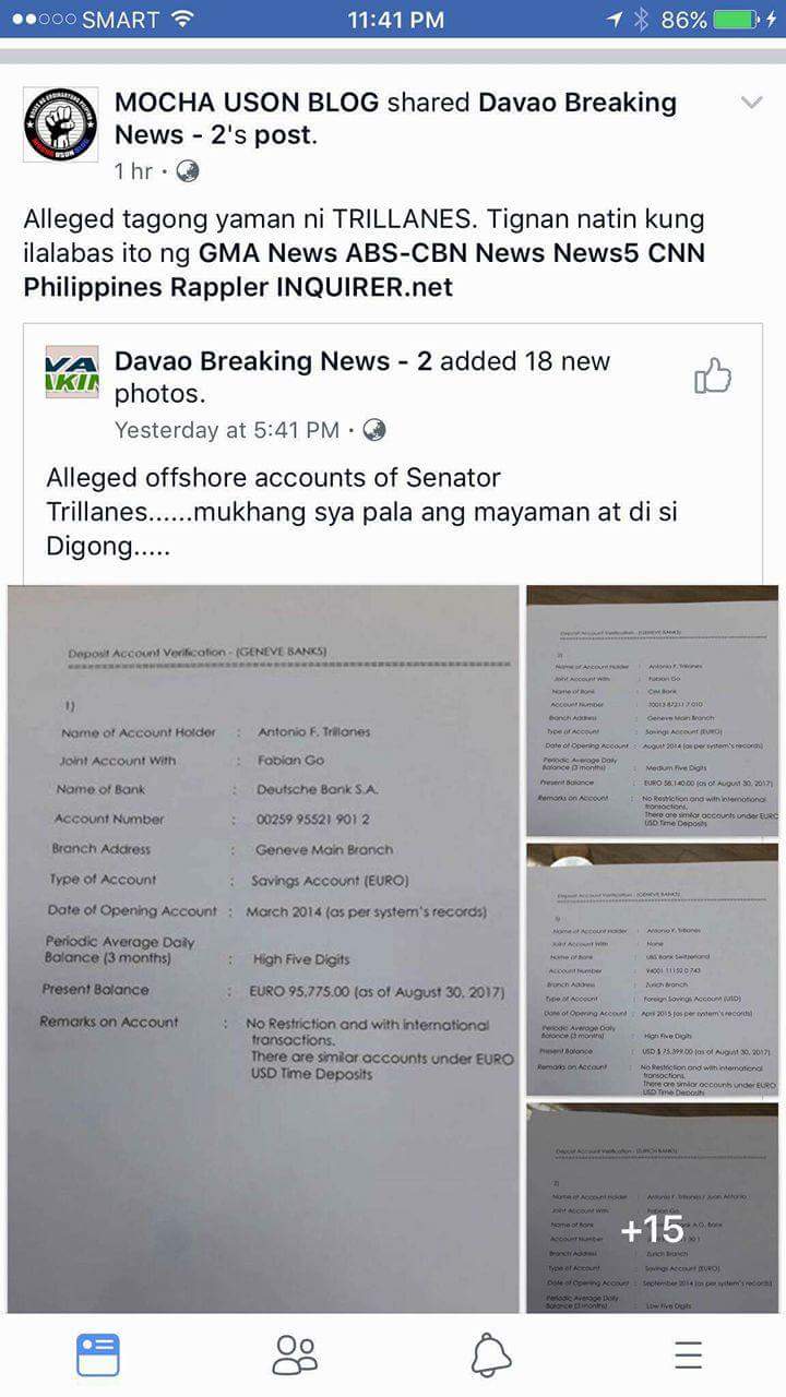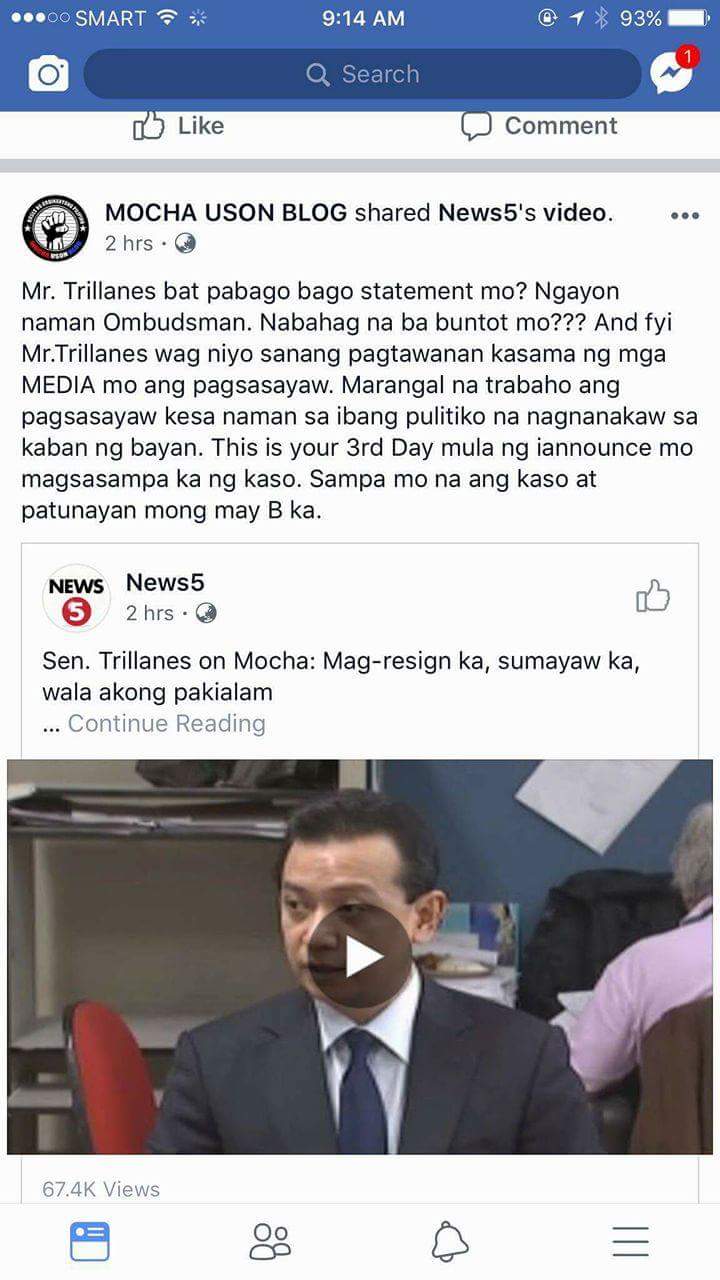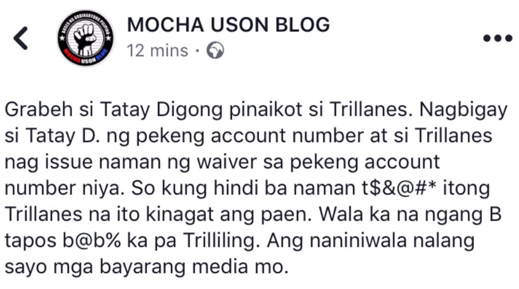Luh, ni hindi nga nababanggit ni Senator Trillanes si Ate Mocha eh. Napansin lang siya kasi binalahura niya si Senator Trillanes sa pamamagitan ng fake bank account. Resibo.