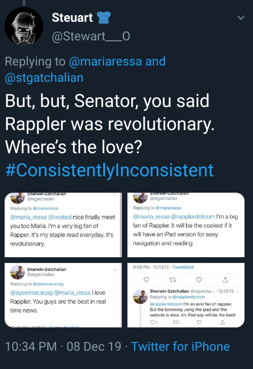 Doble-kara pala si Senator Sherwin, dati love niya ang Rappler is. Hehehe! You can check the thread sa link na ito. Grabe sunog-sunog ang senador.